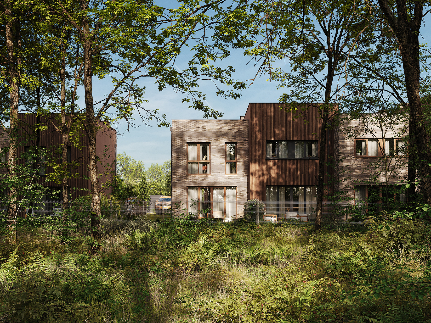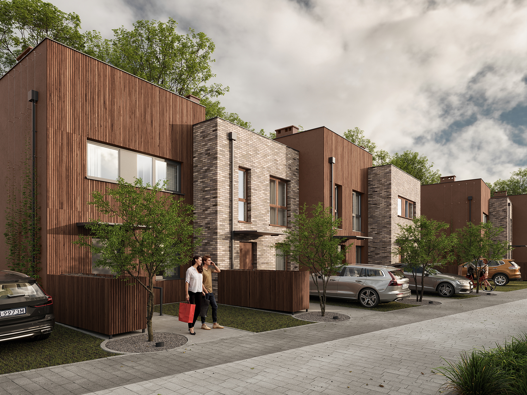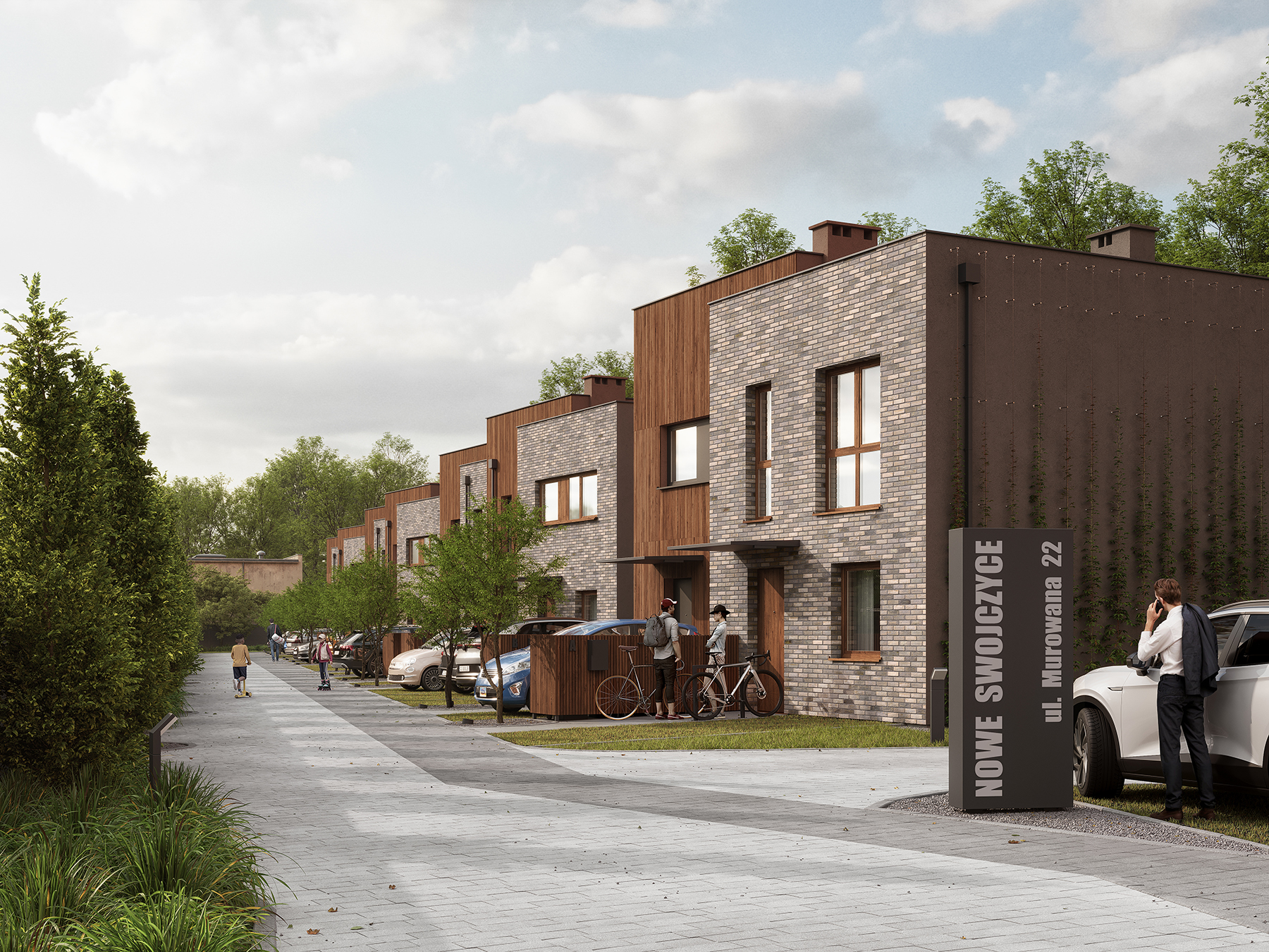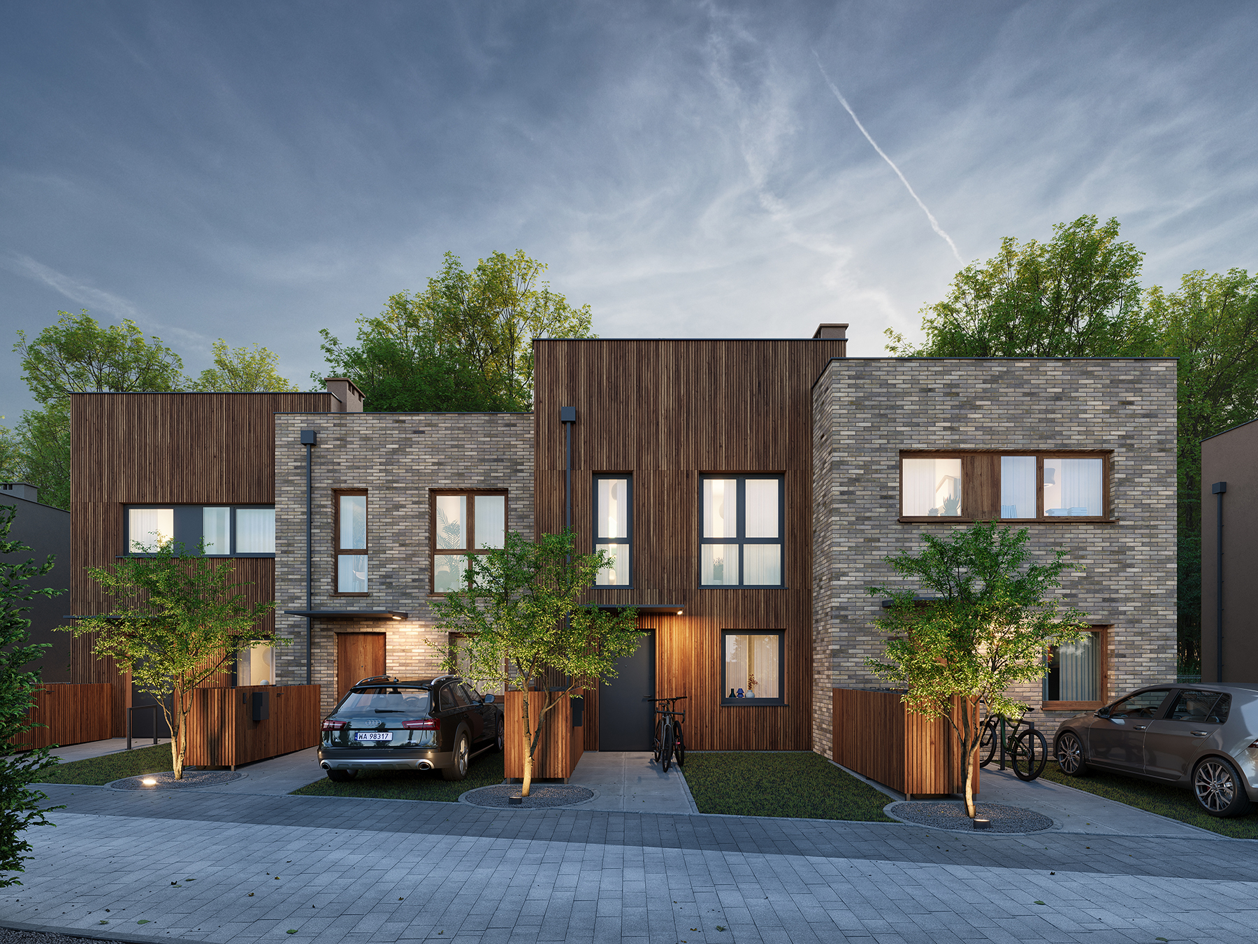 Projekt zakłada stworzenie kameralnego, miejskiego osiedla domów szeregowych, w którym każdy segment posiada swój unikalny charakter. Różnorodność form uzyskano dzięki zróżnicowanej wysokości budynków oraz zastosowaniu odmiennych materiałów elewacyjnych. Ustawienie zabudowy pod kątem względem drogi dojazdowej oraz rozsunięcie segmentów pozwoliło wydzielić bardziej intymne strefy wejściowe i ogrody.