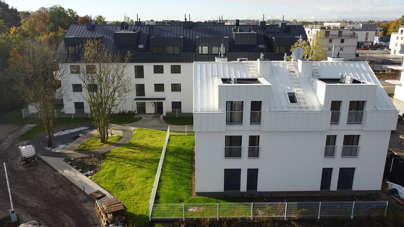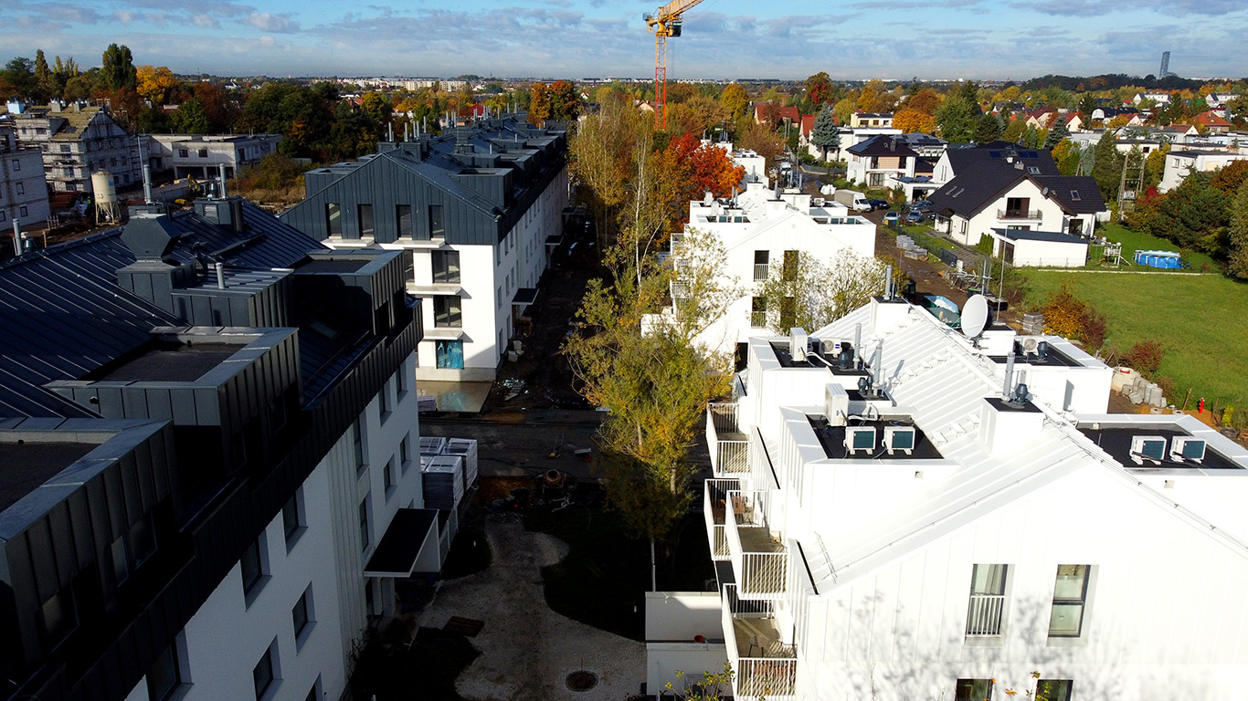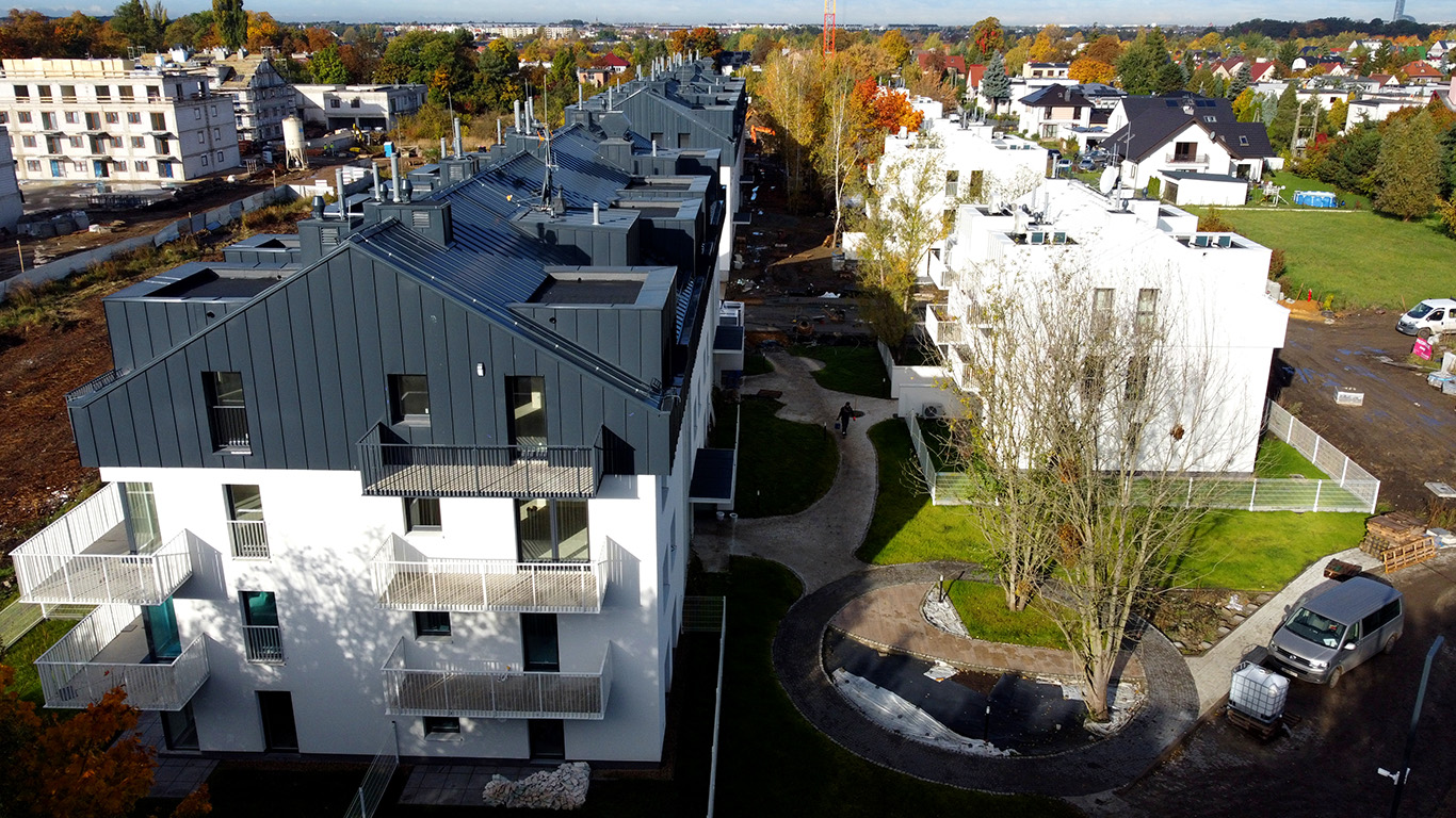 Architektura osiedla to proste formy trzy i czterokondygnacyjnych budynków o skośnych dachach i monochromatycznej kolorystyce, która stanowi tło dla zieleni.