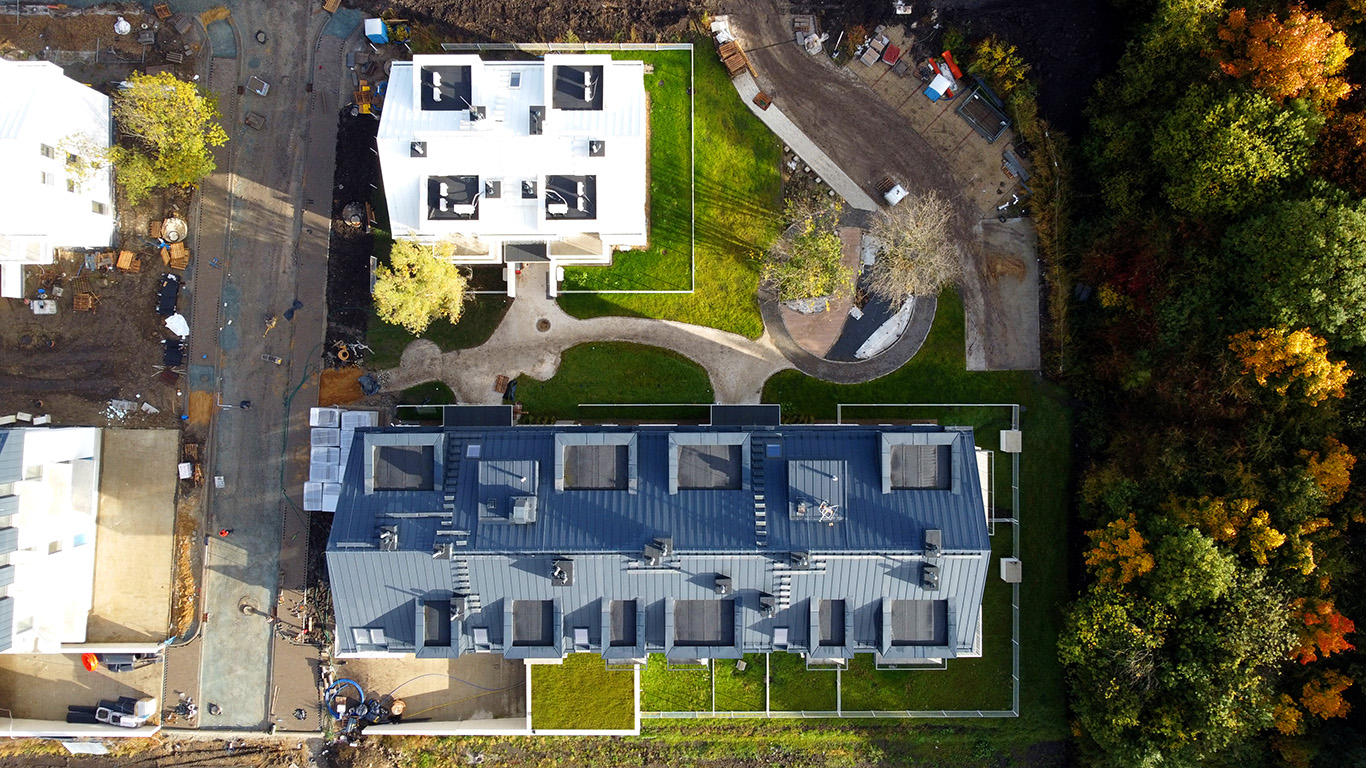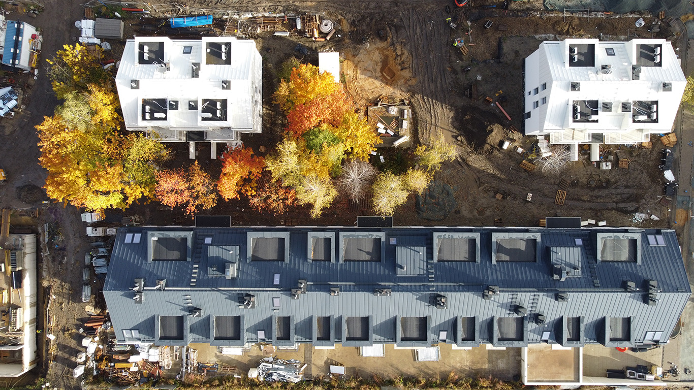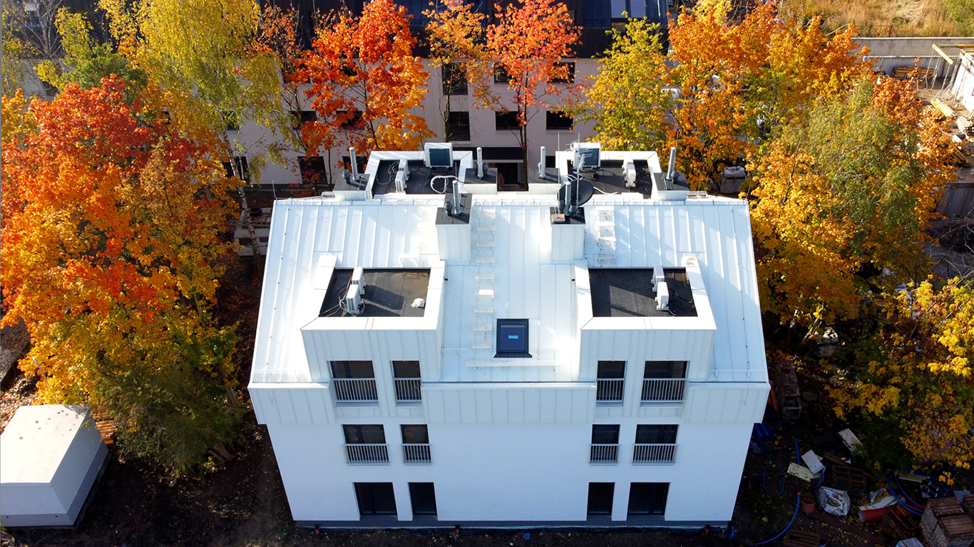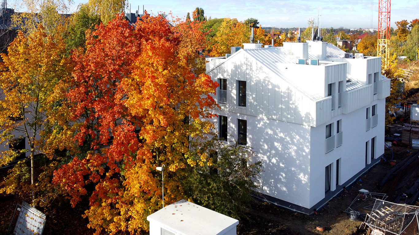 Architektura osiedla to proste formy trzy i czterokondygnacyjnych budynków o skośnych dachach i monochromatycznej kolorystyce, która stanowi tło dla zieleni.