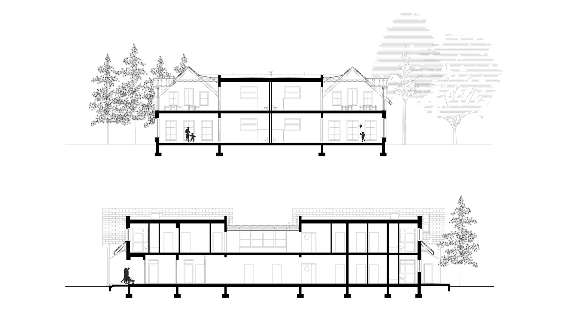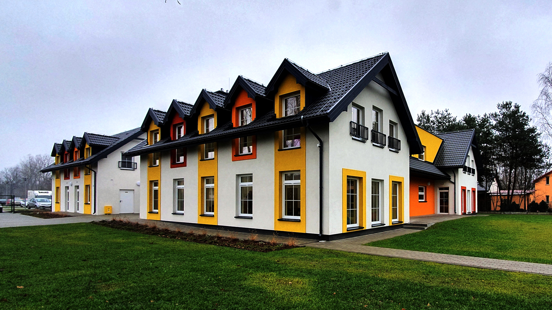 Rozczłonkowanie budynku na mniejsze formy pozwoliło również zachować kameralny charakter zabudowy nawiązujący do architektury miejscowości.