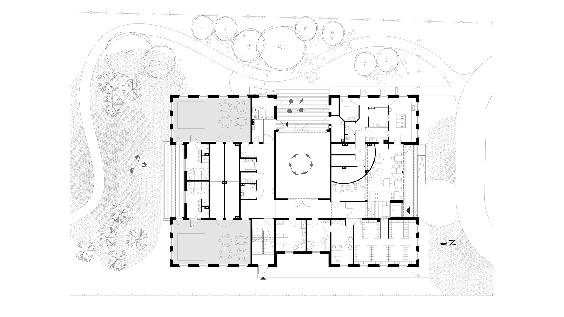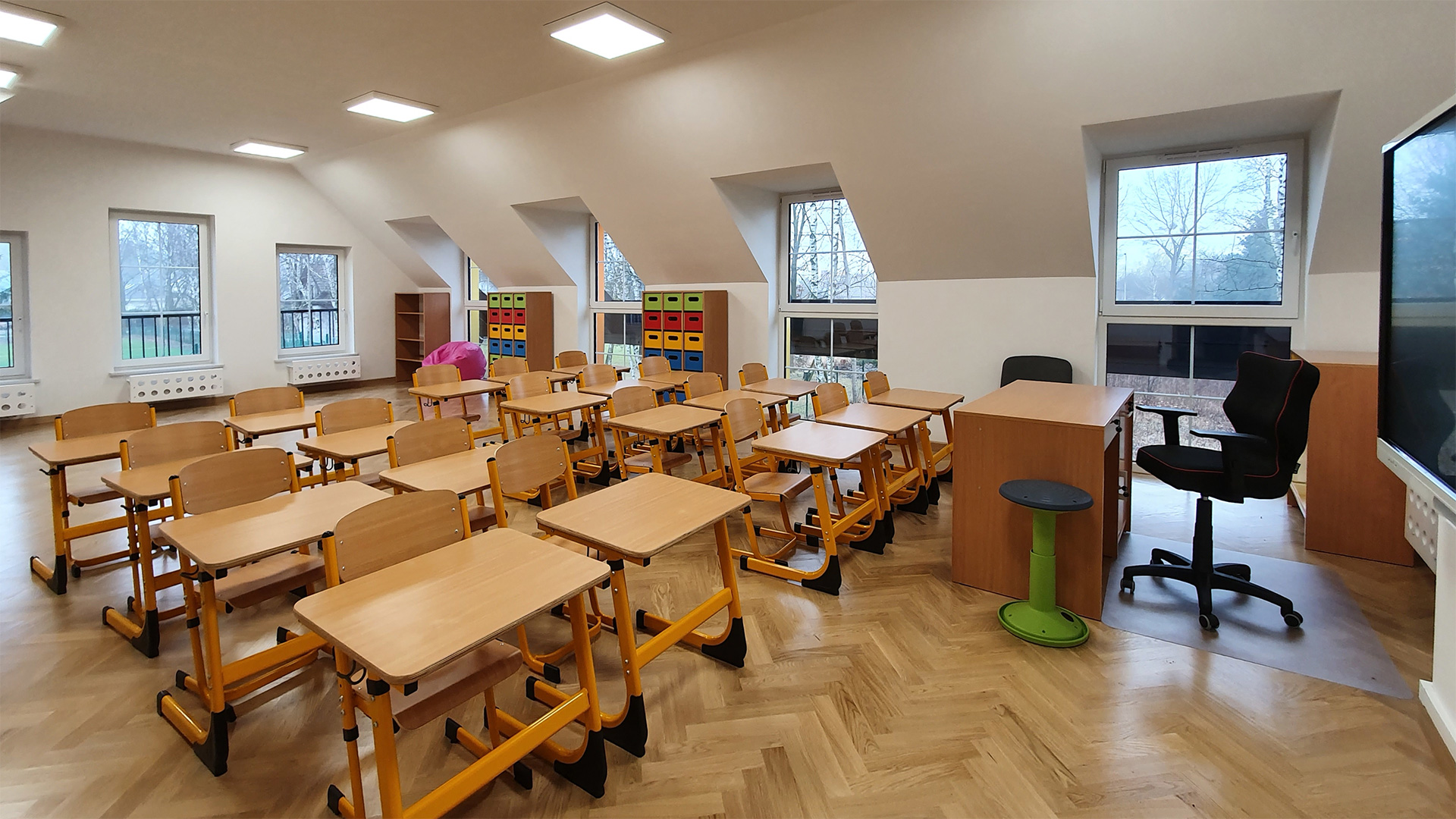 Celem projektowym była organizacja funkcji obiektu na dwóch kondygnacjach w taki sposób, aby wszystkie sale zajęć miał doświetlenie co najmniej z dwóch kierunków: wschodniego i południowego lub południowego i zachodniego.