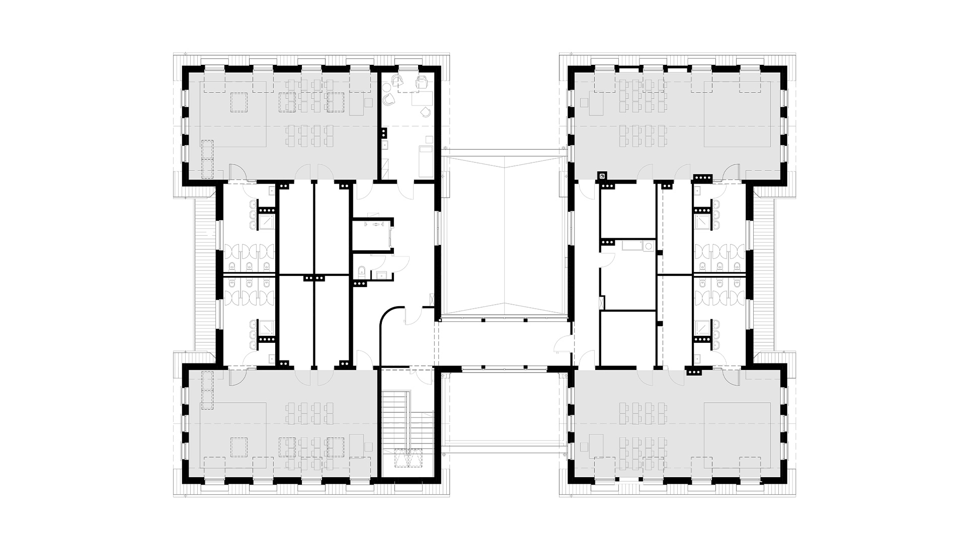 Udało się to osiągnąć poprzez rozbicie budynku na cztery bryły z salami, połączone pomieszczeniami pomocniczymi, salą wielofunkcyjną na parterze, na piętrze łącznikiem.